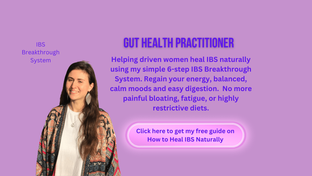 Want to get started right now? Download my free guide to banishing the bloat, and Heal IBS Naturally, with my top 5 tips that everyone on their gut healing journey should start with. Also- these tips are all easy to do at home, so you can start implementing them TODAY! You’ve got this. Download the free guide below.