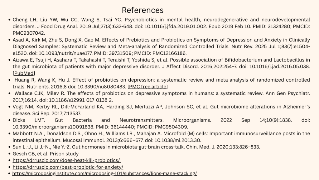 - Asad A, Kirk M, Zhu S, Dong X, Gao M. Effects of Prebiotics and Probiotics on Symptoms of Depression and Anxiety in Clinically Diagnosed Samples: Systematic Review and Meta-analysis of Randomized Controlled Trials. Nutr Rev. 2025 Jul 1;83(7):e1504-e1520. doi: 10.1093/nutrit/nuae177. PMID: 39731509; PMCID: PMC12166186.