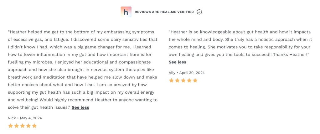 Click the link here to apply for this life-changing program, (note this takes 30 minutes to fill out) and I will reach out for a free follow up assessment to make sure we are a good fit. Or book a 30-minute discovery connection call here to hear my insights on what you may have overlooked and where to focus your gut-healing efforts.
